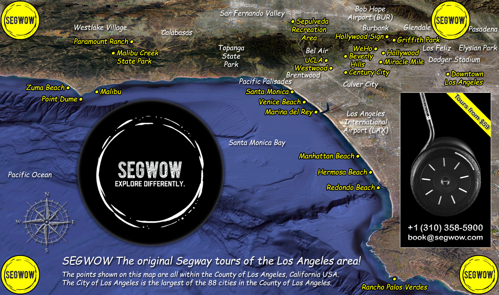 SEGWOW The original Los Angeles area, Celebrity Homes, Beverly Hills, Santa Monica, Venice Beach, Marina del Rey, Miracle Mile, and Hollywood guided Segway tours, and we continue to offer the only Segway tours in many additional Los Angeles area locations, such as Griffith Park, Malibu, Palos Verdes, Manhattan Beach, Hermosa Beach, Westwood Village, and more. We pioneered Segway touring itself! Since 2003. Don't accept anything less than the original! We have the most fun and interesting variety of Segway tours that can be found anywhere, with unparalleled experience and knowledge. No cost to make, change, or cancel a reservation. Communication, comfort mats, all-terrain tires, and handlebar bag on every Segway. Fully-adjustable helmet with visor provided. Free parking. Pick-up and/or drop-off available. SEGWOW is the only AAA approved Segway tour operation in Southern California for 16 consecutive years. Come out and explore with us! No single Segway operation in the world offers more tour choices than SEGWOW. We have 17 different Segway tour destinations, all in the Los Angeles area. Our Segway tour choices include Celebrity Homes in Beverly Hills, Beverly Hills & Rodeo Drive, Santa Monica & Venice Beach, Palisades Park & Third Street Promenade in Santa Monica, Venice Canals & Abbot Kinney Boulevard, Downtown Los Angeles, UCLA Campus, Marina del Rey Harbor, Point Dume & Zuma Beach in Malibu, Malibu Creek State Park, Manhattan & Hermosa & Redondo Beaches in South Bay, Miracle Mile & La Brea Tar Pits, Miracle Mile & The Grove and Farmers Market, Griffith Park & Observatory, Century City, Hollywood Sign & Reservoir, Hollywood Bowl & Mulholland Dam, Palos Verdes, Santa Monica Mountains, and more! The only place to book a tour with SEGWOW is with us directly. We do not do Groupon, LivingSocial, or offer coupons or discounts through any outside sources, or appear on any third party booking sites like Viator, or inflate our pricing to then negotiate it lower, or pay Google to artificially place us at the top of the search results, nor do we pay Yelp or TripAdvisor to feature us or take reservations, or allow anyone to do anything on our behalf. Instead, you will have only direct communication with us! Without all the noise of outside options, we are able to offer the best tours at the best value all of the time, and a gratuity is not necessary. We never charge extra for a private tour, which we will try to accommodate whenever requested; others will demand absurd amounts for a private tour. If you think you found what seems like a good deal through Groupon, LivingSocial, or elsewhere, it's probably not as good a deal as you may think. While you may be paying less with someone else, you will also be getting less. Ask us about price matching and we will try to find a comparable tour of ours at similar pricing to what you may have found. Looking to rent or hire a Segway? We can provide Segway services that will get you access to a Segway. Let us know how we may be of assistance with any Segway services. |